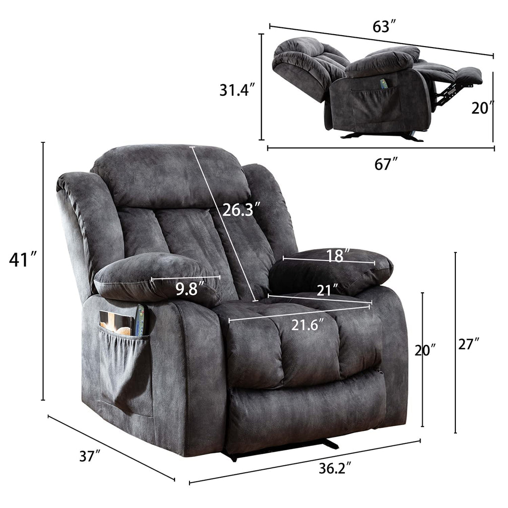 ➤【Suitable Size & Convenient Design】Measure 36.2"W x 37"D x 41"H, Seat Height - 20", Seat Dimensions - 21.6"W x 21"D. Weight Capacity - 300lbs. Kindly please confirm the size before buying. Pocket on the right side of the recliner chair keeps remotes and other small items, you can watching TV, read newspaper on the recliner. ➤【Massage & Heating Function】The four points massage (back, lumbar, thigh, leg) with 5 adjustable modes and 2 intensity options, offers you a full body massage at your home. Massage, heating functions can controlled by a single multi-function remote for your easy use. There is timer function in 15/30/60 minutes which is convenient for you to set massaging time. ➤【Glider Recliner Chair】When the footrest is closed, the chair can rocker back and forth, which is suitable for mother and baby to rest together. Pull buckle beside the armtrest, backrest Reclines at 110 degrees and 145 degrees with comfort and thick cushions to accompany your work, leisure and rest time all day round. ➤【High Quality Material】Luxurious breathable recliner with high-density foam and laminated veneer lumber (LVL) system to provide maximum comfort and stability, suitable for living room, bedroom and home theater room. Tip: The recliner comes with 2 boxes and we ship them on the same day but the carrier may deliver them to your door on different days. ➤【Buy With Confidence】CANMOV provide free exchange for installation problems, damaged and missing parts with 1-year warranty guarantee, feel free to contact us for any purchase. CANMOV provide helpful, prompt and friendly customer service at your disposal.