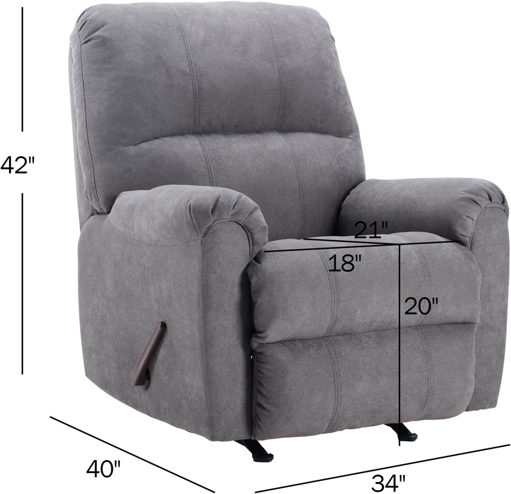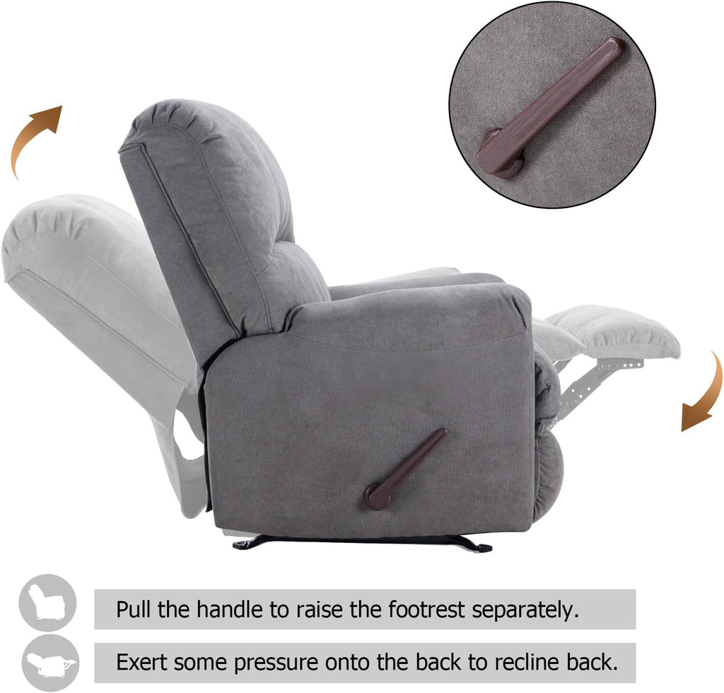 This Rocker Recliner Chair is crafted for everyday relaxation, combining smooth manual reclining with a gentle rocking motion. Upholstered in soft fabric and generously padded with high-density foam, it delivers reliable support for the head, back, lumbar area, and legs. With its ergonomic structure and modern curved silhouette, this chair fits seamlessly into living rooms, bedrooms, or reading spaces.