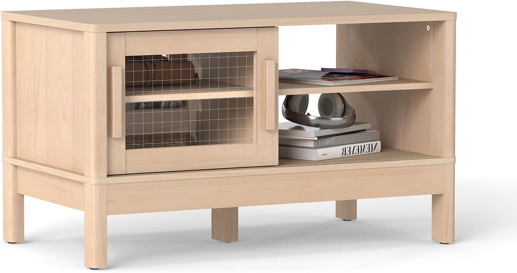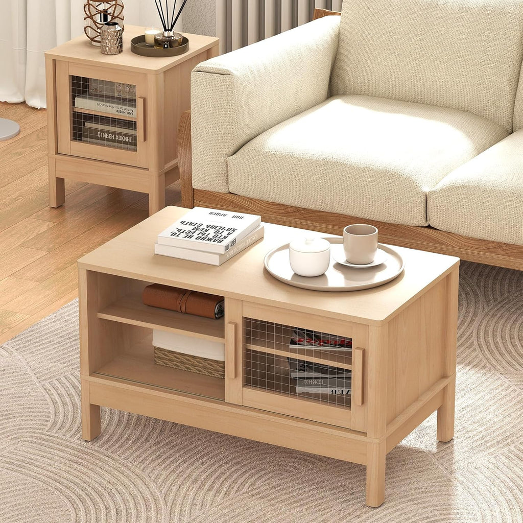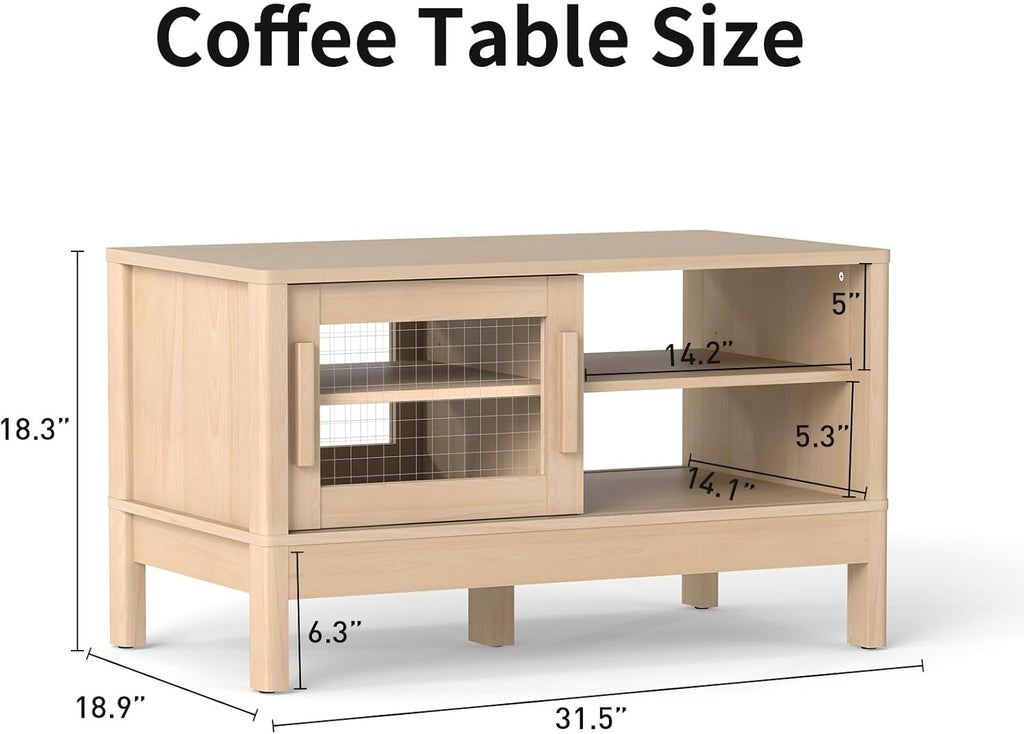 This Modern Coffee Table with Sliding Acrylic Doors combines style and functionality. It features two checkered acrylic sliding doors with wooden frames for easy access, double-sided storage, and adjustable interior shelves. Made from engineered wood with sturdy legs and a central adjustable foot, it’s durable, stable, and perfect for any living space.