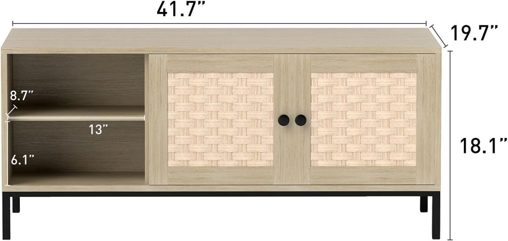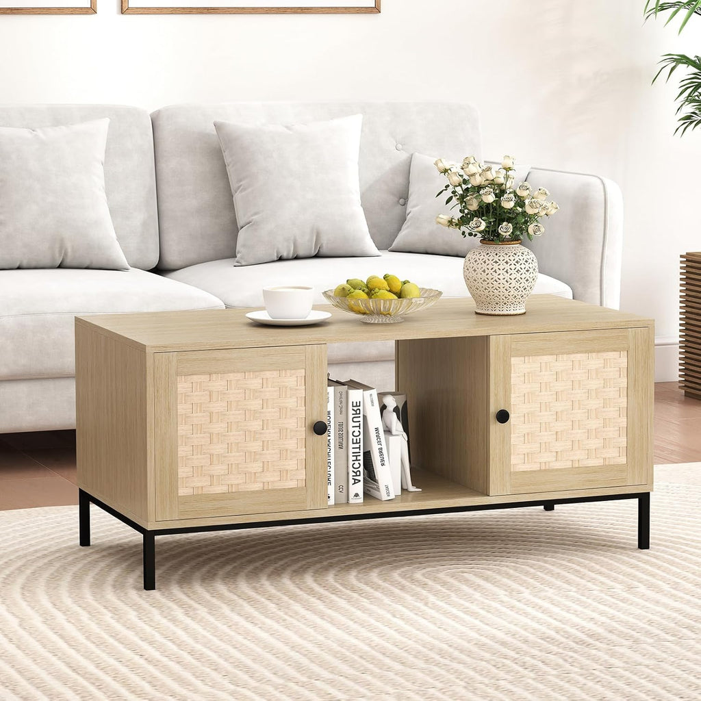 The Modern Woven Coffee Table combines contemporary style with practical storage. Featuring woven doors for hidden storage and an open center shelf for easy access, it keeps your living room organized. The light oak top paired with black metal legs adds a minimalist touch, while the sturdy frame ensures durability and easy assembly.